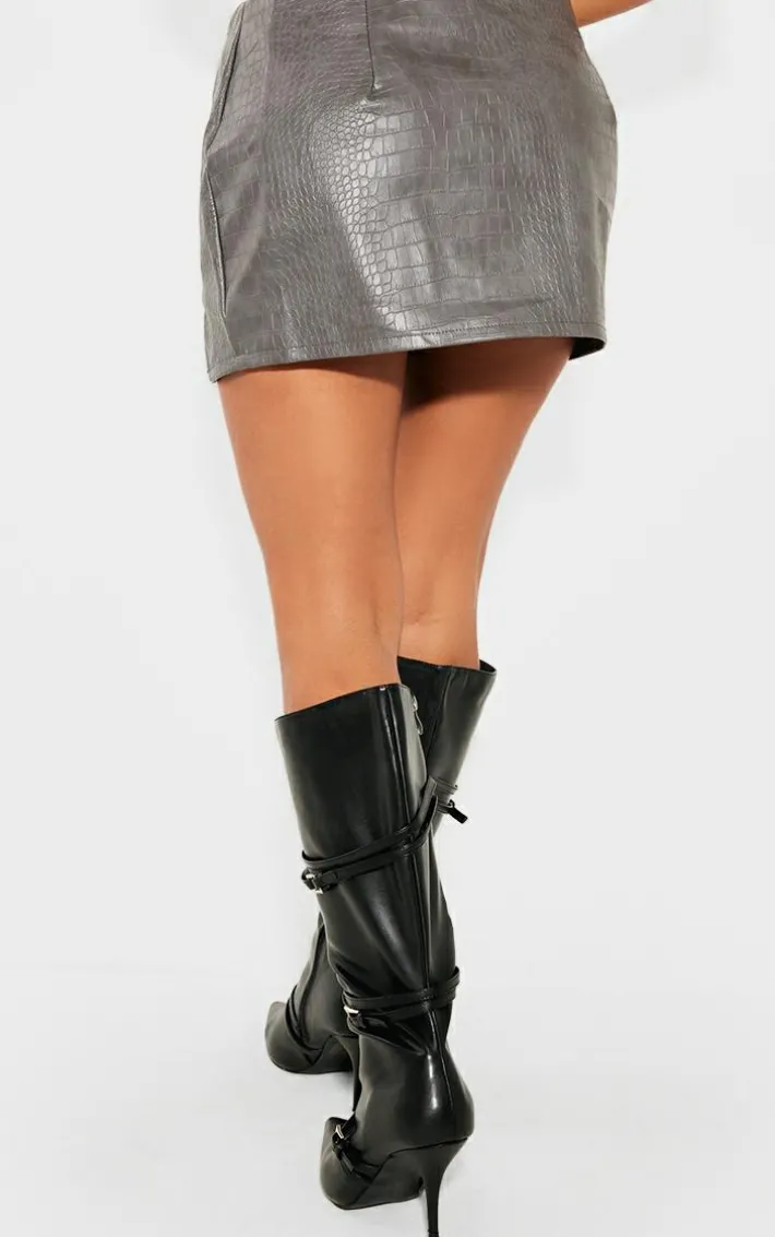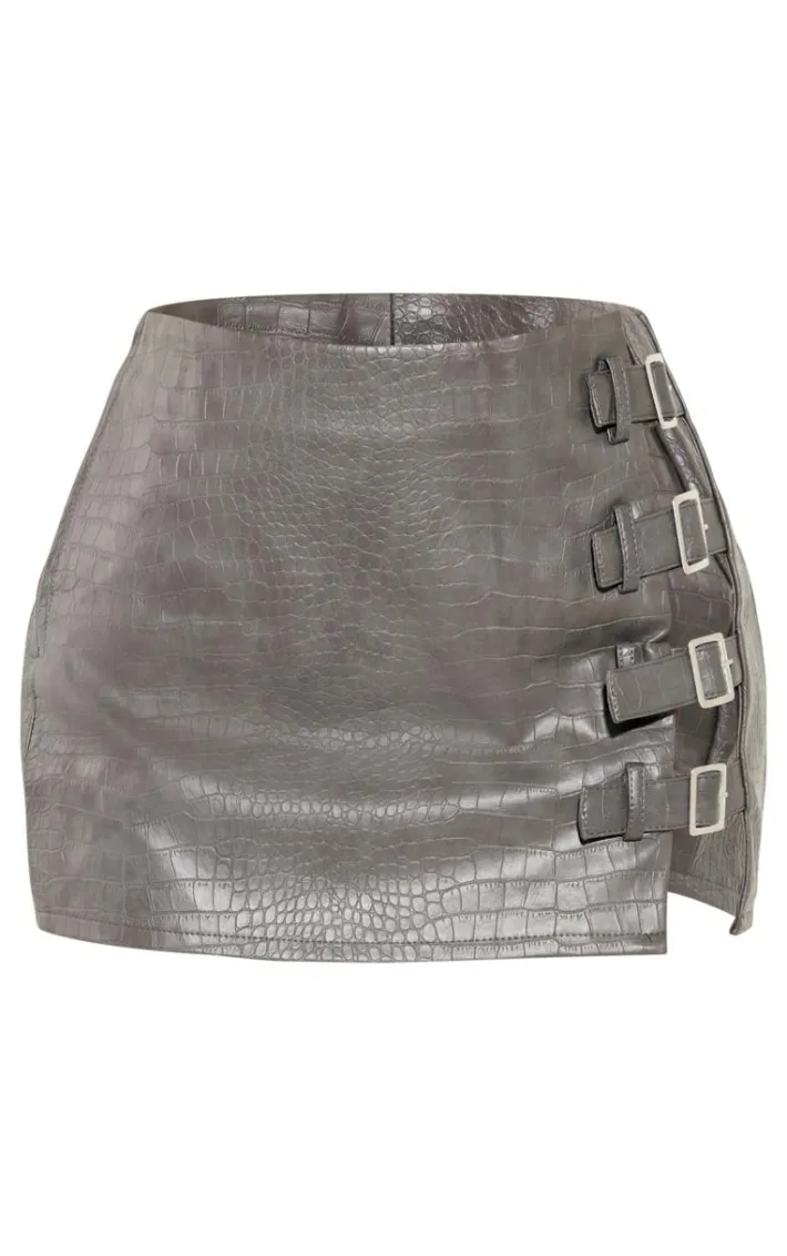 Add an edge to your weekend look with this petite grey croc faux leather buckle detail mini skirt. Brought to you in a grey croc faux leather material with buckle detailing and a mini length, how can you resist? Style this mini skirt with the matching top and heeled boots for a look that is sure to make heads turn wherever you go.