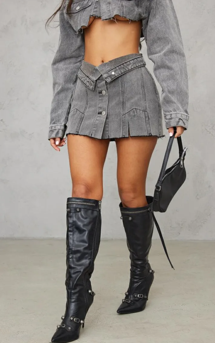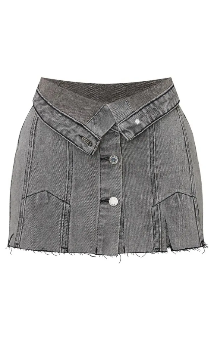 Have heads turning for all the right reasons in this petite grey distressed denim foldover micro mini skirt. Brought to you in a grey wash material with a distressed design and a micro mini length, we are obsessed. Pair with the matching top and heeled boots to earn all the style points.