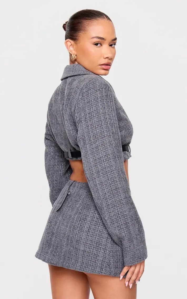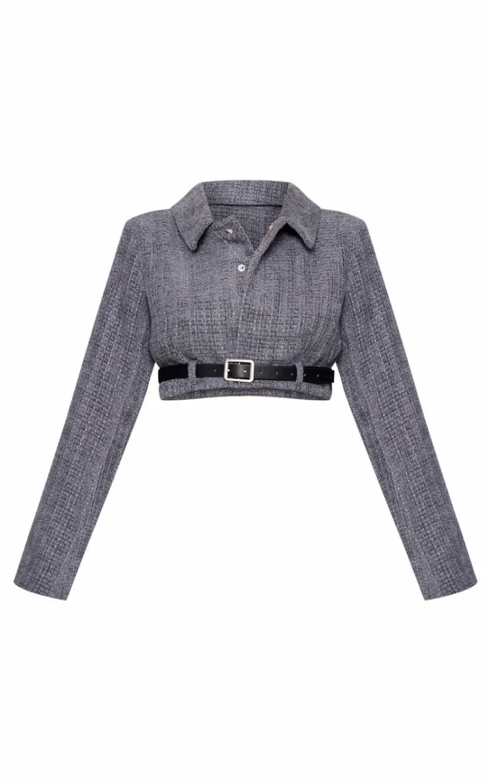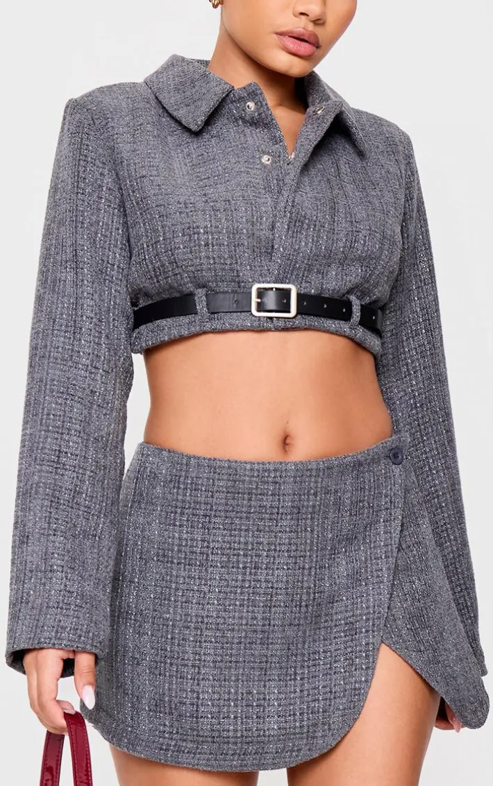 Introduce some corpcore looks into your wardrobe with this petite grey textured woven belt detail cropped blazer. You’re going to be earning all the compliments with its grey textured woven fabric, belt detail and cropped fit. Style this cropped blazer with the matching skirt, heels and a faux leather handbag for the ultimate finish.