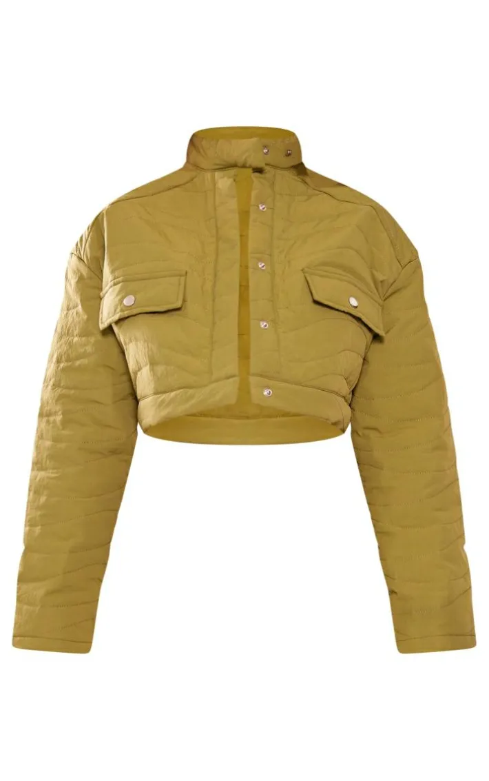 Switch up your new season style game with this petite khaki quilted long sleeve cropped jacket. Brought to you in a khaki hue quilted material with long sleeves, button popper fastenings and a cropped fit, we are obsessed. Pari this cropped jacket seamlessly with the matching skirt, a crop top and chunky boots for a fierce off-duty ‘fit like no other.