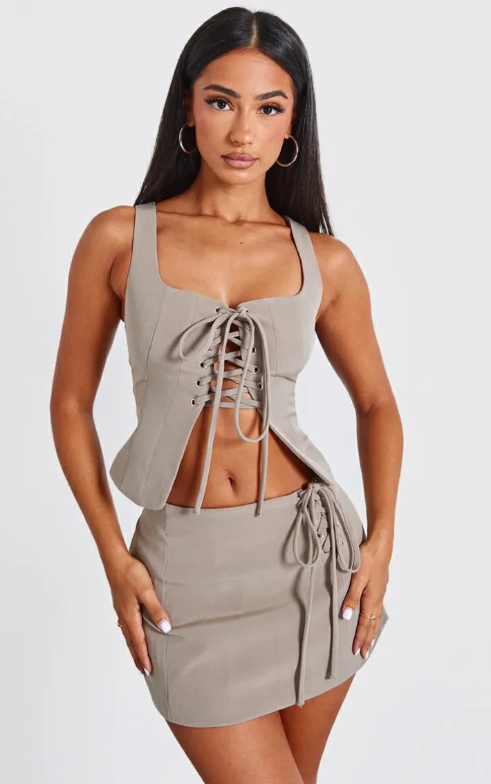 Take your weekend look to the next level with this petite khaki woven lace up corset, you’ll be stealing all the stares. Its on-trend khaki color, woven material and lace up detail will make you want to reach for this again and again. Simply style with the matching mini skirt, a statement bag and your fave heels to step out with confidence this weekend.