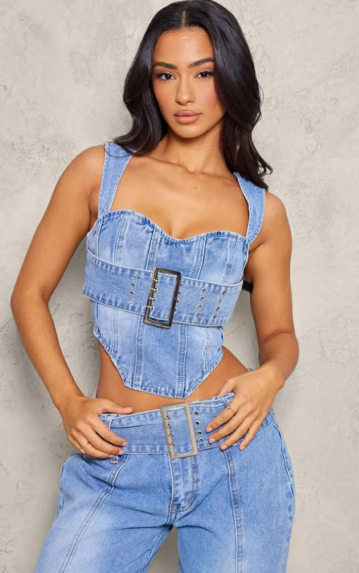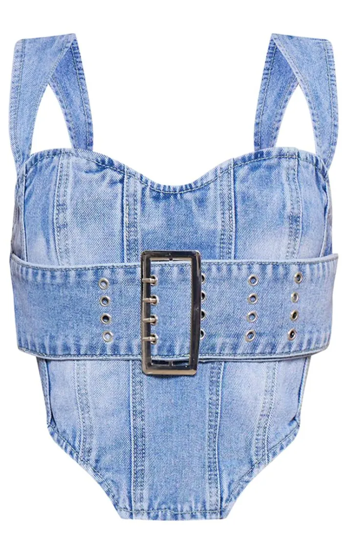 Stay on trend for the new season in this petite light blue denim buckle detail corset top. Brought to you in a light blue denim material with buckle detailing and a flattering corset fit, how can you resist? Style this denim top with the matching bottoms, heels and some gold accessories for a look that is sure to have all eyes on you.