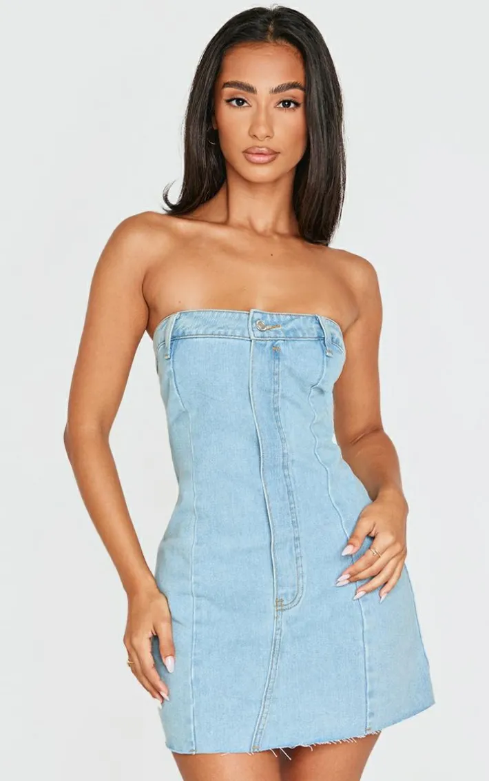 Add some seriously chic vibes to your new season wardrobe with this petite light blue wash denim bandeau mini dress, you’re sure to be earning all the chic vibes whatever your plans. This dress includes a light blue wash denim material with a bandeau design and a mini length, it’s a definite yes from us. Team this petite mini dress with clear slip-on heels and your fave accessories for the perfect weekend-ready fit.