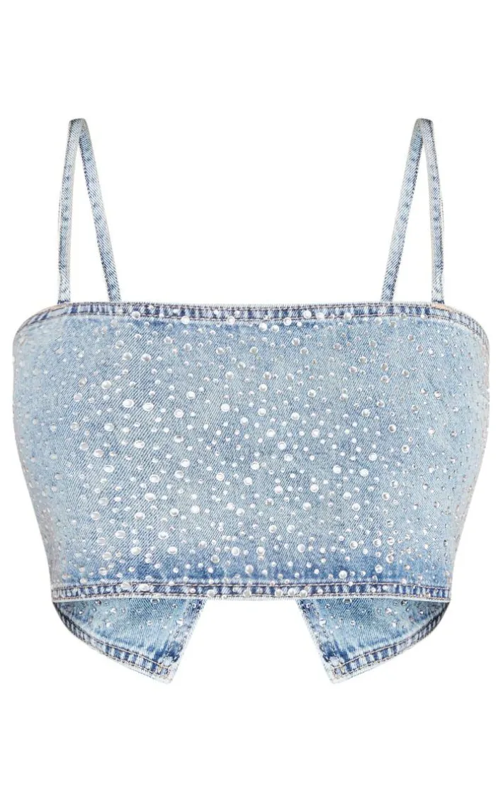 We’re in love with this petite light blue wash diamante denim straight neck crop top for your next weekend plans. With a light blue wash denim material, diamante details and a straight neck design, what more could you ask for? This petite crop top is the answer to all your what-to-wear dilemmas and we know you won’t be able to resist adding it to your basket. Team with the matching jeans, clear heels and silver accessories for a weekend-worthy finish.