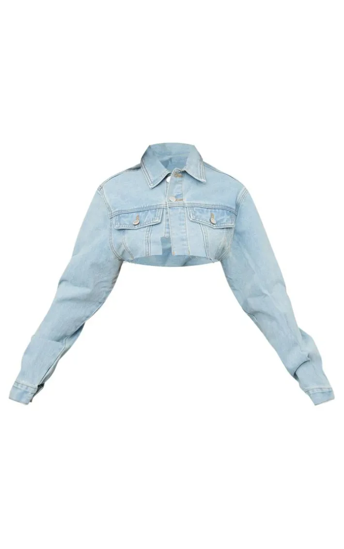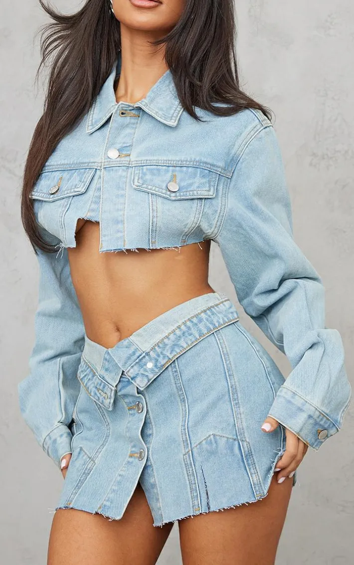 Make a statement this season with this jacket. Featuring a light blue hue with a distressed design and a cropped fit. Style with the matching skirt, some knee-high boots and a cute bag for a glam look that will get heads turning.