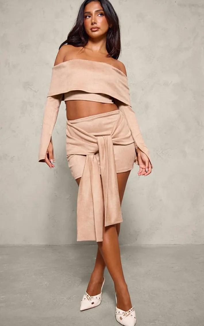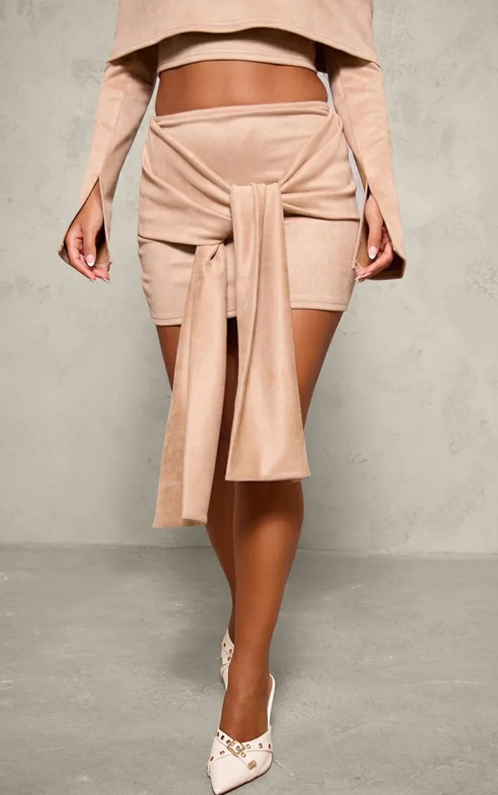 Bring all the luxe faux suede feels to your weekend look with this petite light brown faux suede tie front mini skirt.Made from a light brown hue faux suede material with a tie front design and a mini fit, how can you say no? We are loving this mini skirt styled with the matching top, heels and gold accessories for a simple yet chic look that is guaranteed to make heads turn.