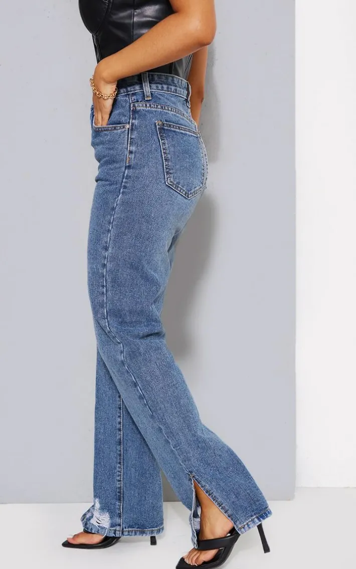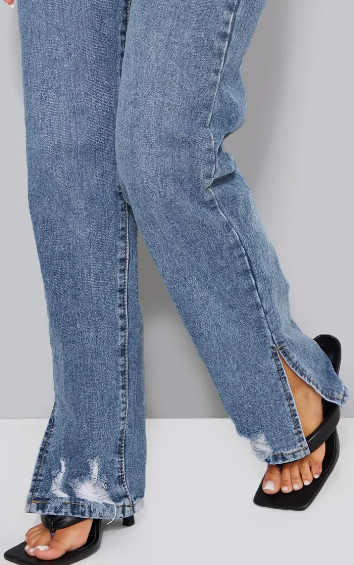 Take your weekend look that extra mile with these jeans doll. Featuring a mid blue washed denim material and a split hem and distressed detailing. Team with a white cropped Vest, fresh kicks and simple accessories for a chilled day vibe we love.