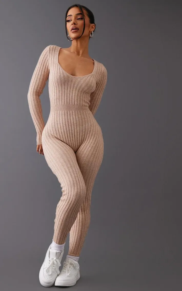 Switch up your off-duty wardrobe with this petite oatmeal long sleeve knitted jumpsuit and earn some extra style points. Its oatmeal knitted material, it is giving us that clean girl aesthetic that is so on-trend right now and its figure-hugging fit with waist detail will help compliment your body perfectly. Whether you have plans for a wholesome walk or have a day running errands, this jumpsuit is a must-have. Complete this look with chunky white sneakers, gold hoops, and a trench coat for an effortlessly chic vibe.
