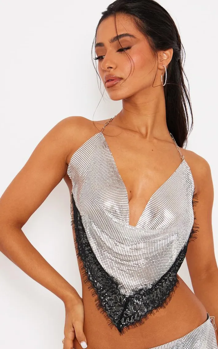 Steal all the stares this weekend with this petite silver lace detail chainmail crop top. Made from a silver chainmail material with lace trim detail and a cowl halter neckline, what’s not to love? This petite crop top is sure to turn heads for all the right reasons and we know you won’t be able to say no to all the compliments. Team with the matching mini skirt, clear heels and silver accessories for a look that won’t go unnoticed.