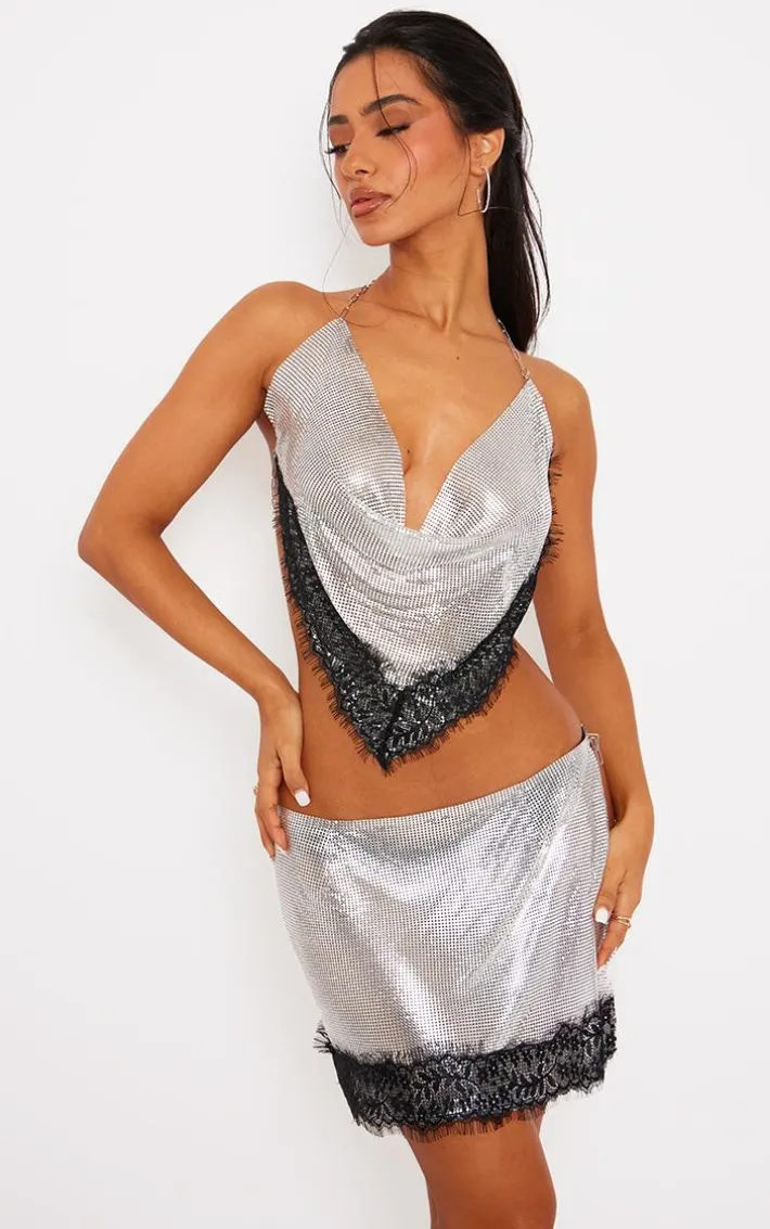 Channel all the luxe vibes this weekend with this petite silver lace detail chainmail mini skirt and be sure to earn all the compliments. With a silver chainmail material, lace detailing and a split hem design, what more could you ask for? If you’re looking to be the center of attention this weekend then you need this petite mini skirt. Team with the matching top, court heels, and a silver bag for a look that is sure to impress.
