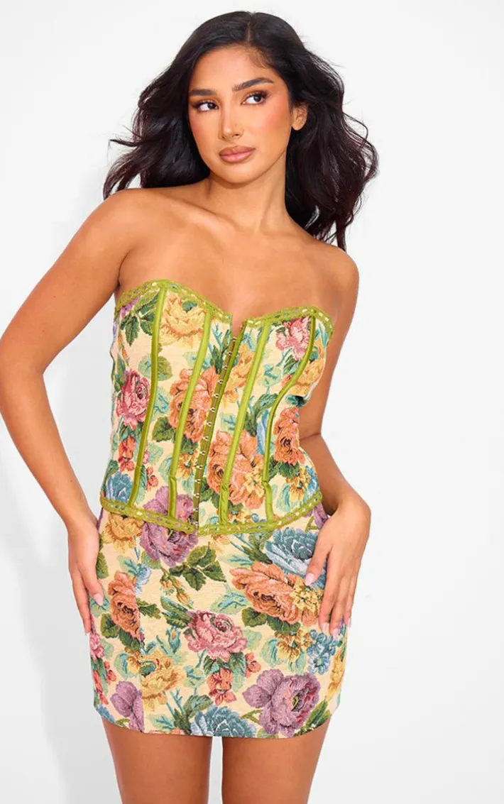 Set major trends this season with this petite stone floral jacquard longline corset. Brought to you in a stone jacquard material with a floral design, what more could you want ? Its longline fit will have you feeling effortlessly chic all season long. Team with your fave accessories and the matching skirt for a fool proof finish we are obsessing over.