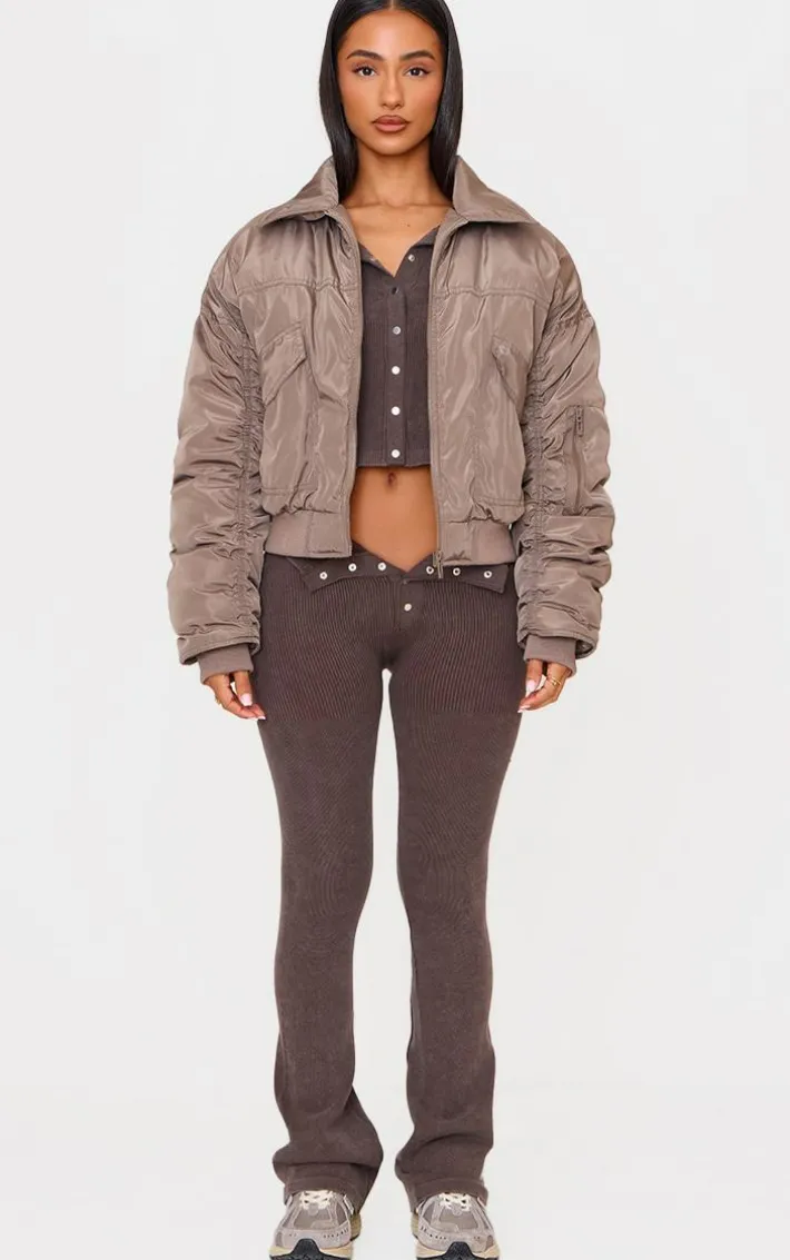 Throw this petite taupe ruched sleeve bomber jacket on this weekend for a look like no other. With its neutral taupe tone, edgy ruched sleeve design and bomber style, this jacket deserves to be bagged. Team with a pair of brown leggings and sneakers to complete the look.