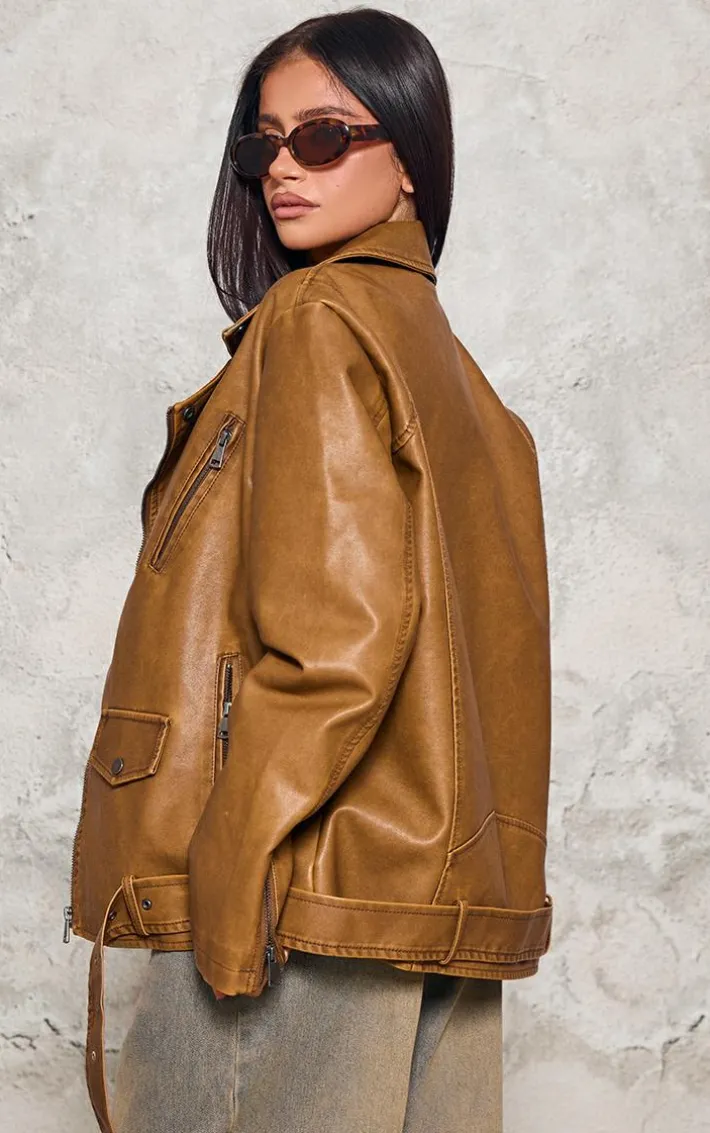 Add a staple piece to your new season attire with this petite washed brown distressed look faux leather longline biker jacket. Brought to you in an autumnal washed brown shade, with an edgy distressed look design, faux leather material and longline finish. Throw this over some washed denim jeans and a white crop top to finish the look.
