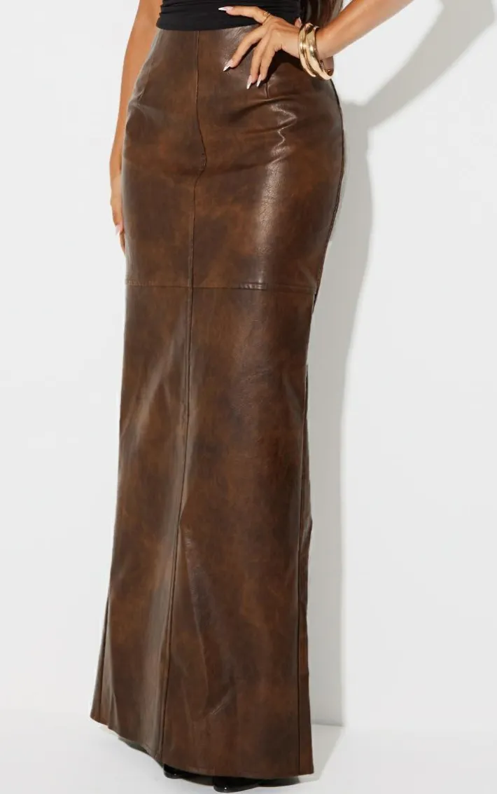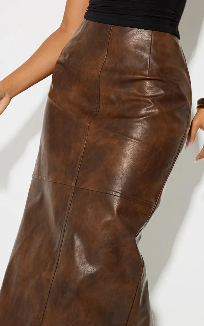 You’ll be the best dressed at any occasion with this petite washed brown faux leather seam detail maxi skirt. With an unreal washed brown shade to add a little edge to your wardrobe, a luxe faux leather material and a seam detail, we’re obsessed. team with a black crop top, gold bangles and heels for a look that will have you at the top of your style game.