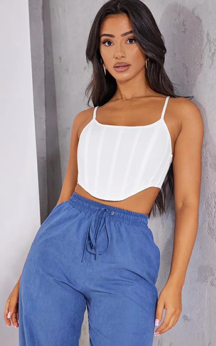 This top is giving us all the glam vibes for your weekend wardrobe. Featuring a white woven material with a corset design and a cropped fit. Just add wide leg bottoms and heels for an effortlessly chic vibe.