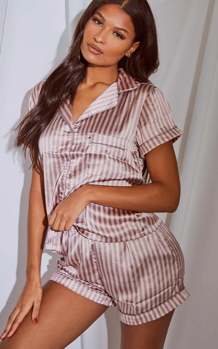 This pj set is the perfect addition to your sleepwear collection. Featuring a button up short sleeved shirt and elasticated shorts both in a pink and grey satin material, we are obsessed.