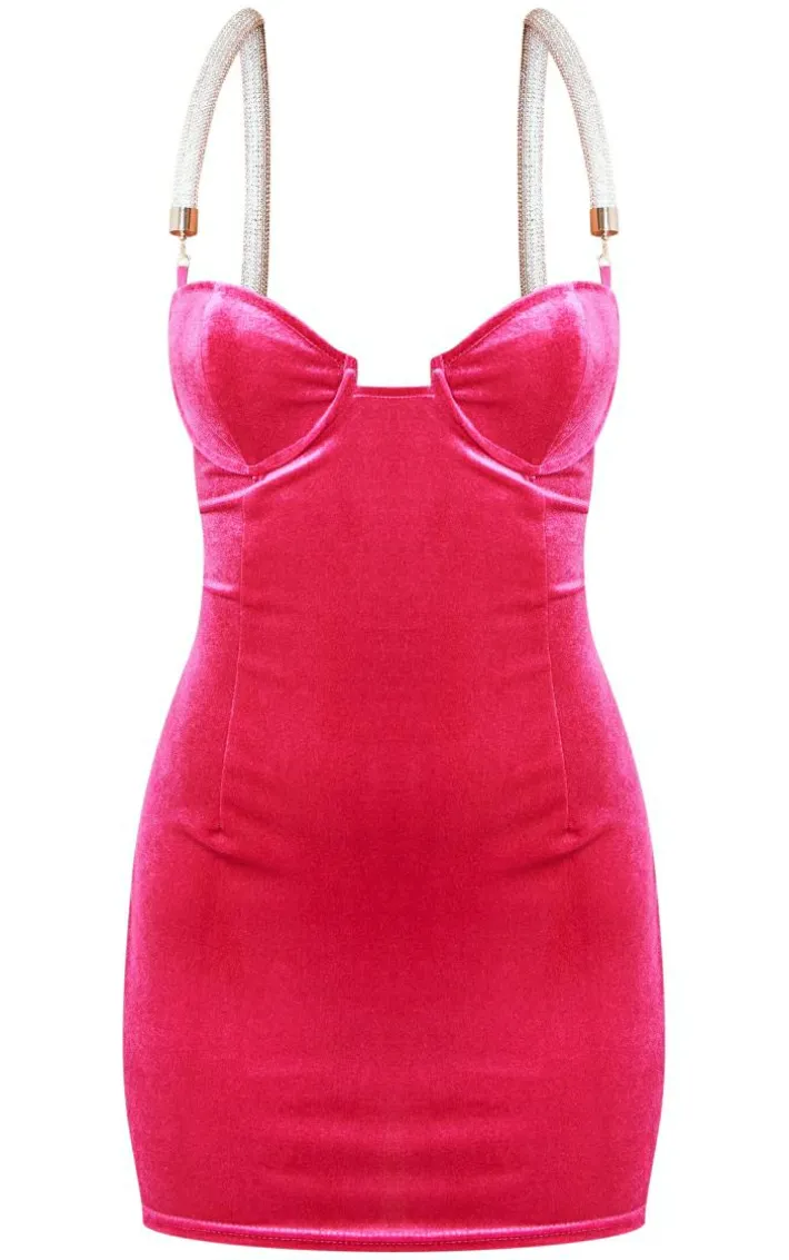 When the weekend calls for a little drama this pink diamante strap velvet underwired bodycon dress will have you at the center of attention. It is made using a pink velvet material with a diamante strap and an underwired design, what more could you want ? Style this dress with clear slip-on heels and statement accessories to elevate the look further