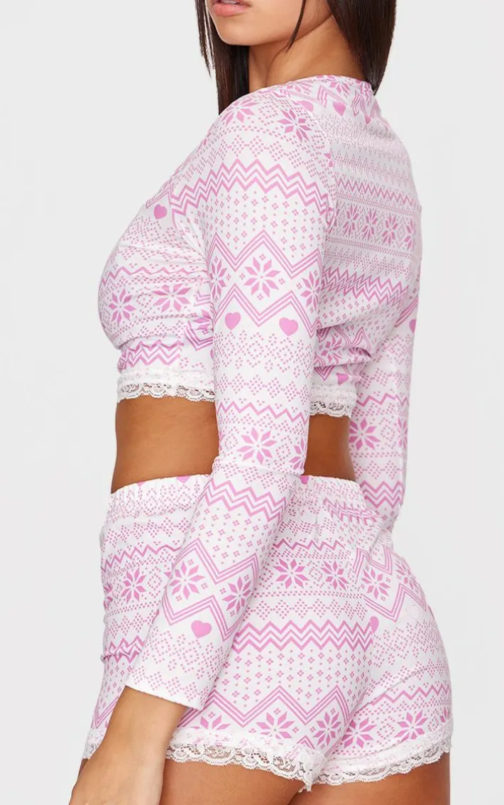 Say hello to festive PJs with this pink fairisle print lace trim short PJ set. With their delicate lace trim detailing, pink fairisle print and soft PJ material, they’re just what you need for those cosy season nights. Stay warm by styling with a pair of fluffy slippers and a bath robe.
