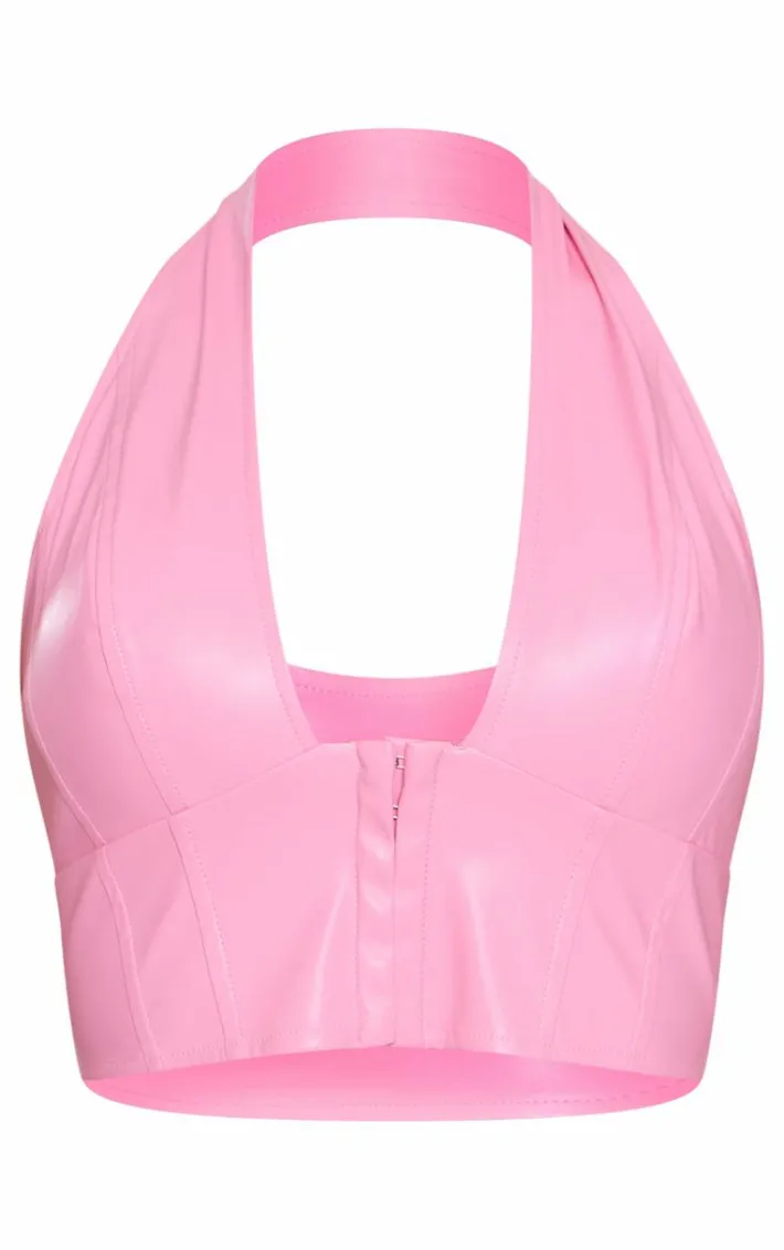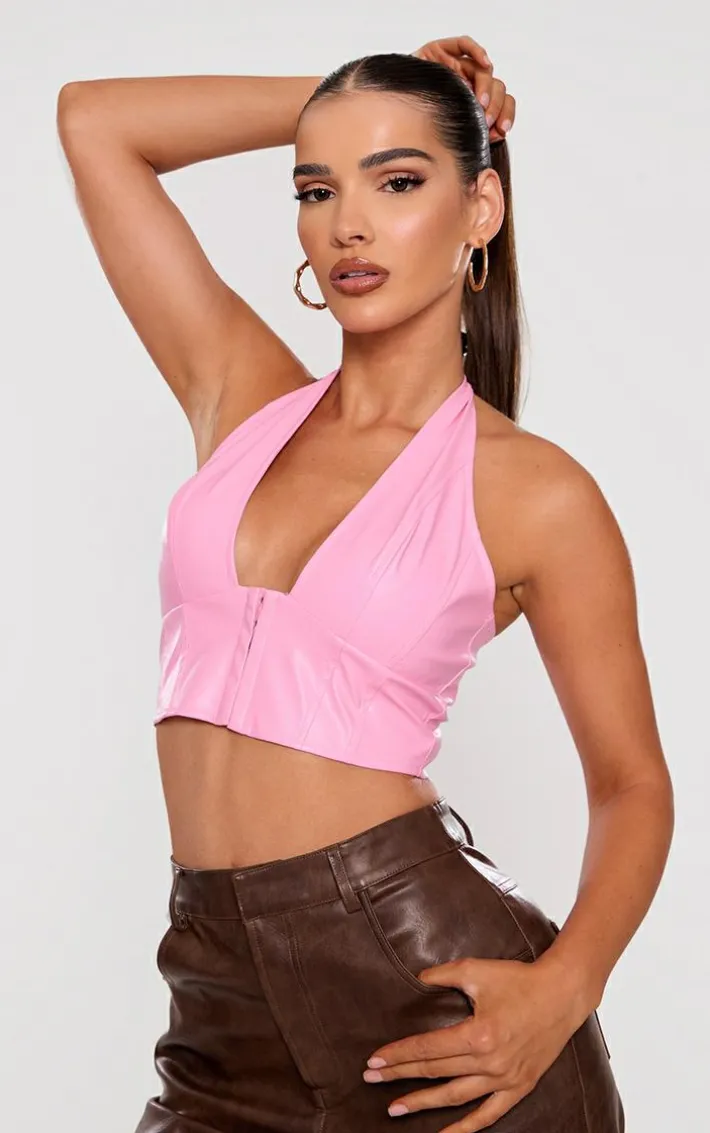 We can’t stop thinking about this pink faux leather hook and eye plunged crop top for a weekend-worthy look. Brought to you in a statement pink shade, with a luxe faux leather material and hook and eye detailing, what’s not to love? The plunged design gives the ultimate figure-flattering finish, so team with some leather look pants and hoop earrings for a look that won’t go unnoticed.
