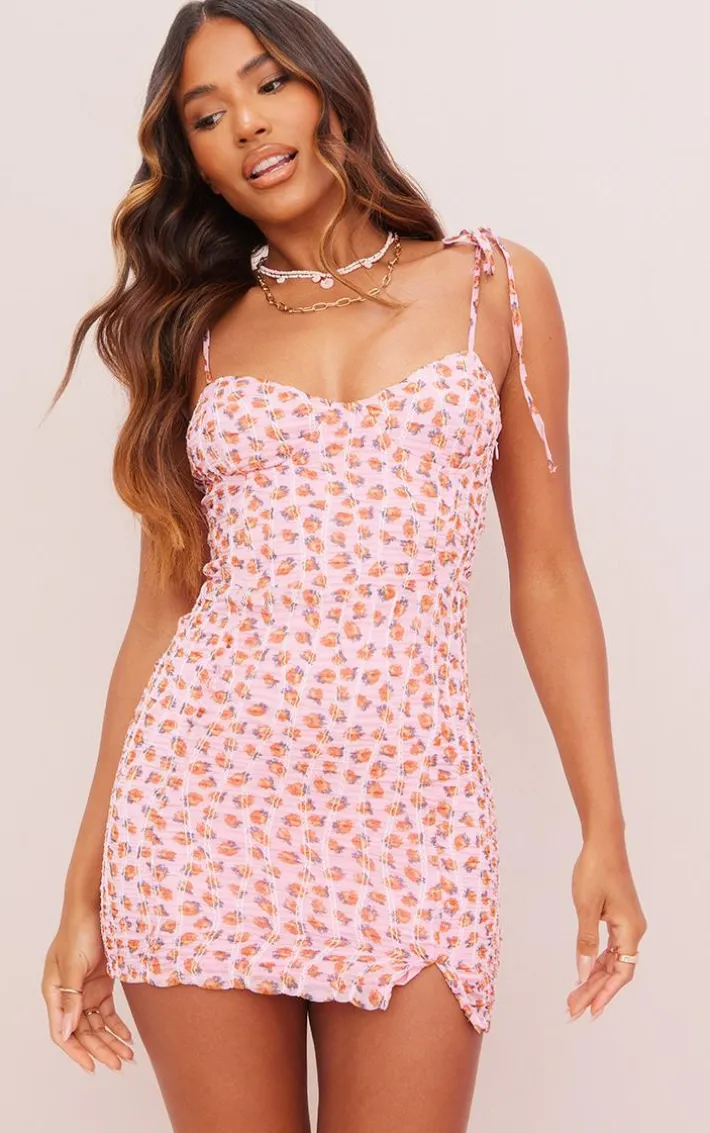 This dress is a must-have for the new season. Featuring a pink floral chiffon material with a cup detail, tie strap fastening and bodycon fit, we are obsessed. Pair with slip on sandals and hoops for a next-level finish.