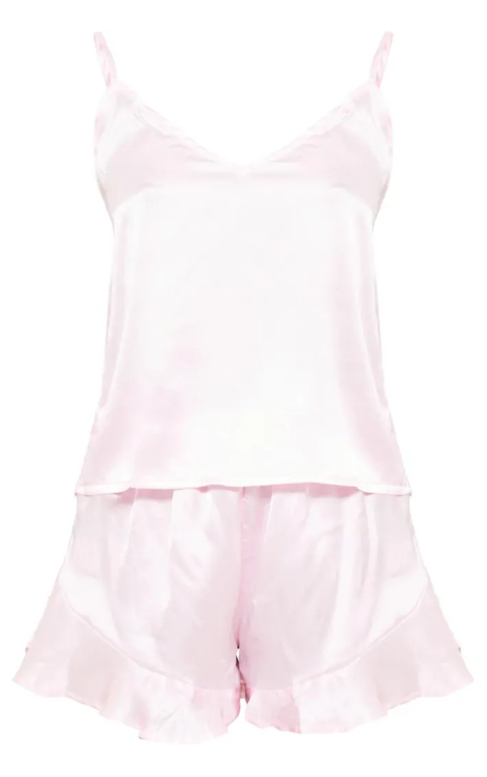 No weekend plans? No problem. This pj set is the perfect luxe replacement. Featuring a pink satin material with a cami deisgn and frill detail. Team it with relaxing plans at home.