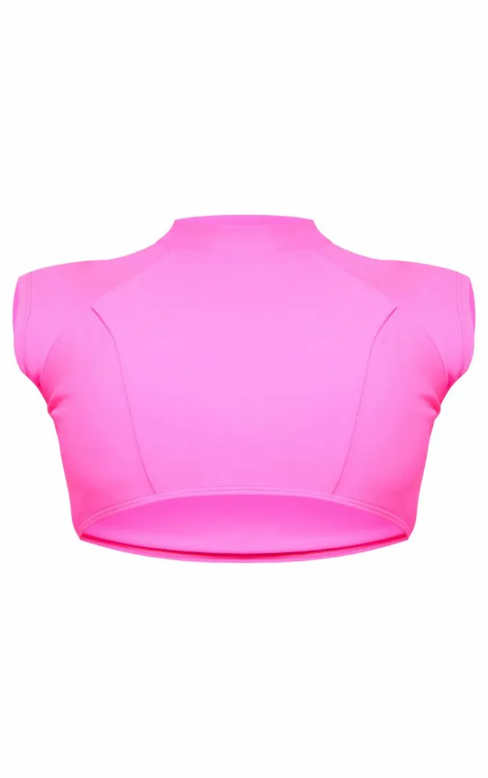 Add some bold hues into your vacay wardrobe this season with this pink high neck short sleeve swim top. Made from a pink hue material with a high neckline and short sleeves, what’s not to love? Figure-flattering and sure to make you stand out from the crowd, this swim top is the ultimate must-have. Team with the matching bottoms, chunky sandals and oversized shades for a glam finish.