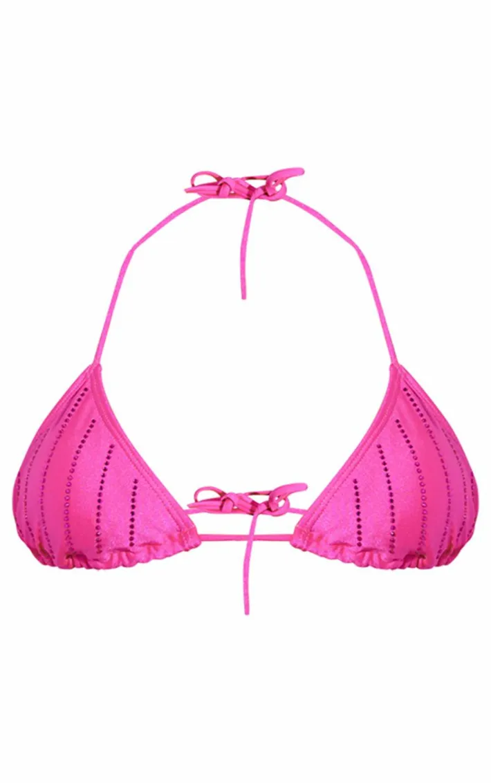This pink hot fix micro mini bikini top is at the top of our bikini hit list. “I have way too many bikinis”, said no one ever. How can you resist this with its hot pink material and figure-flattering? Style this micro mini bikini top with the matching matching bottoms, statement jewelry and shades to have heads turning for all the right reasons.