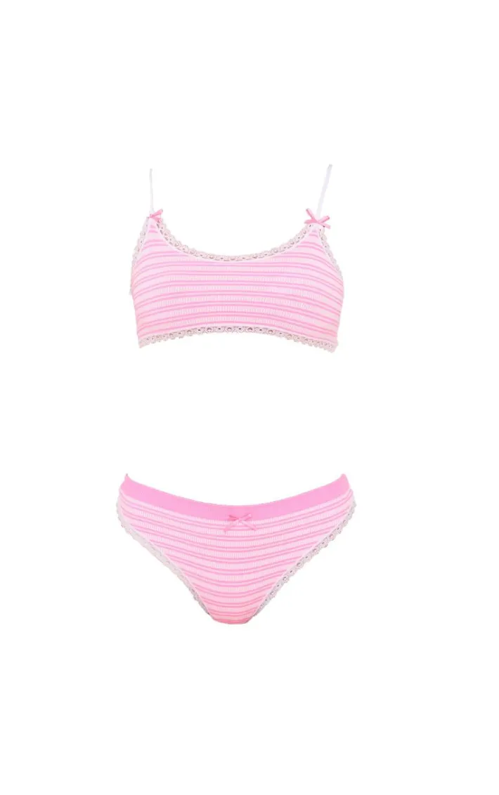 We’re loving this dreamy pink lace trim textured stripe bralette and thong lingerie set. Brought to you in an unreal pink hue, with a lace trim design and textured stripe material, we just can’t get enough. Style with a satin robe, gold accessories and a pair of slippers for a look like no other.