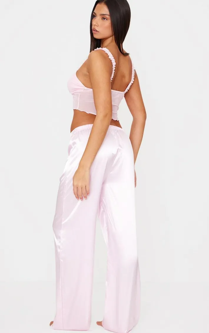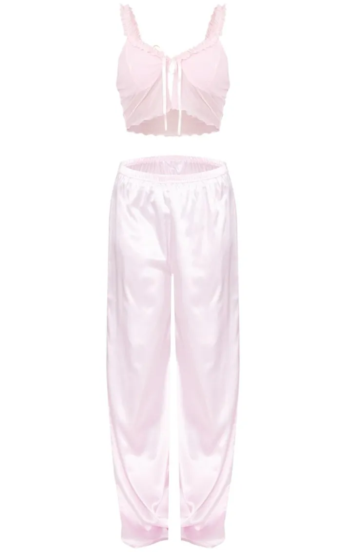 Your night times have never looked as chic as with this pink mesh tie front cami long satin PJ set. Brought to you in an irresistible pink hue satin fabric, with a front tie cami top and long satin bottoms, you’ll be feeling so feminine. Layer up with a bath robe and slippers for a cosy combo.