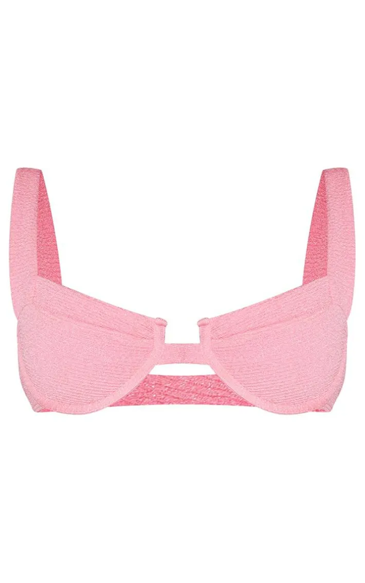 Keep your poolside vibe fiercely feminine with this bikini top. Featuring a pink mini crinkle material with a square neckline and underwired detailing, what’s not to love? Team with matching bikini bottoms and complete the combo with an anklet for a beachy vibe.