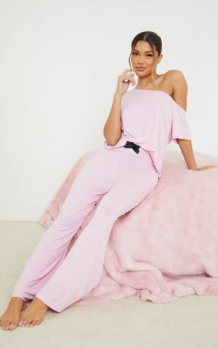 Get ready for the perfect nights sleep with this PJ set. Featuring an off-the-shoulder top and bottoms, both in a pink material with a relaxed fit, we are obsessed. Team these with fluffy slippers and a night mask to complete your after-dark look.