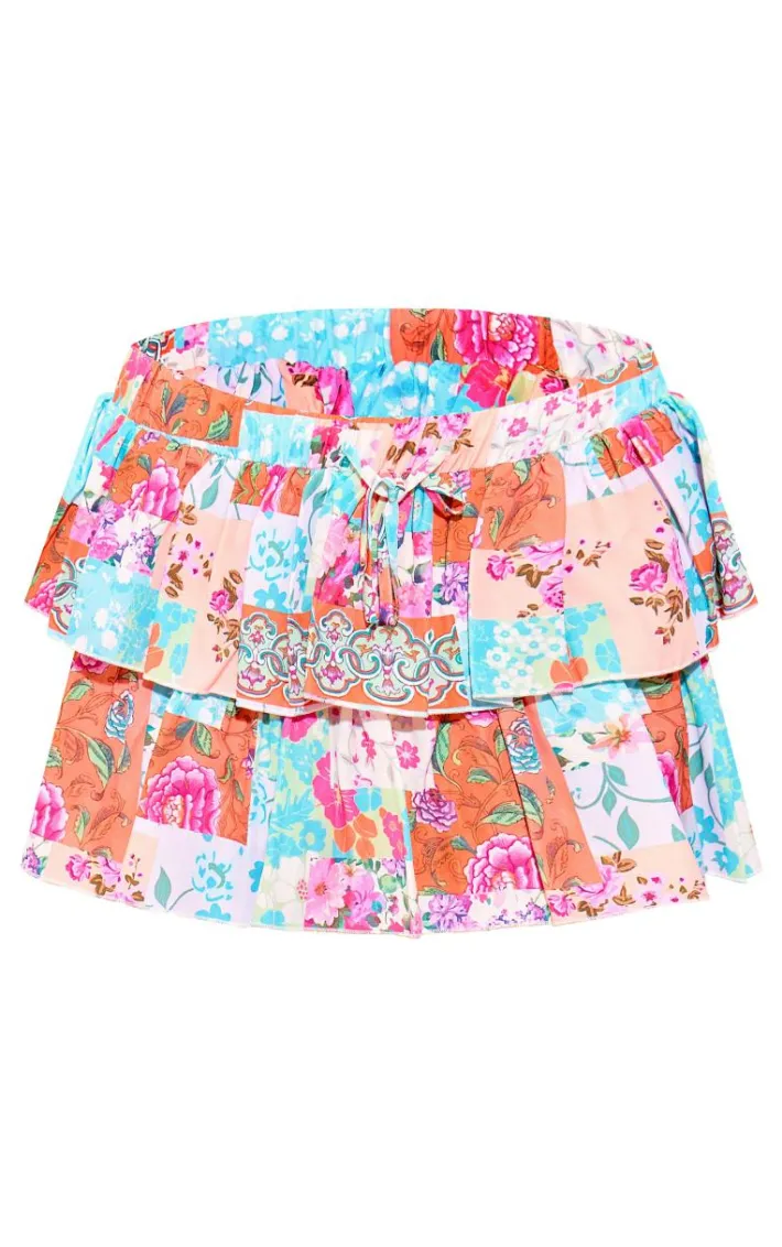 Stay in style this season with this pink patchwork printed tiered frilly mini skirt. Brought to you in a pink patchwork printed material with a tiered detail and frilly design, this mini skirt is calling your name. Style with a white crop top, sandals and gold accessories for all the style points.