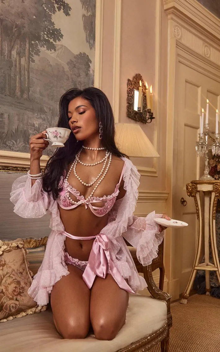 This bra is simply perfect for the new season. Featuring a pink material with a rose embroidered lace frill detail and an underwire, we are obsessed. Team with the matching pieces and simple accessories to complete the figure-worshipping look.