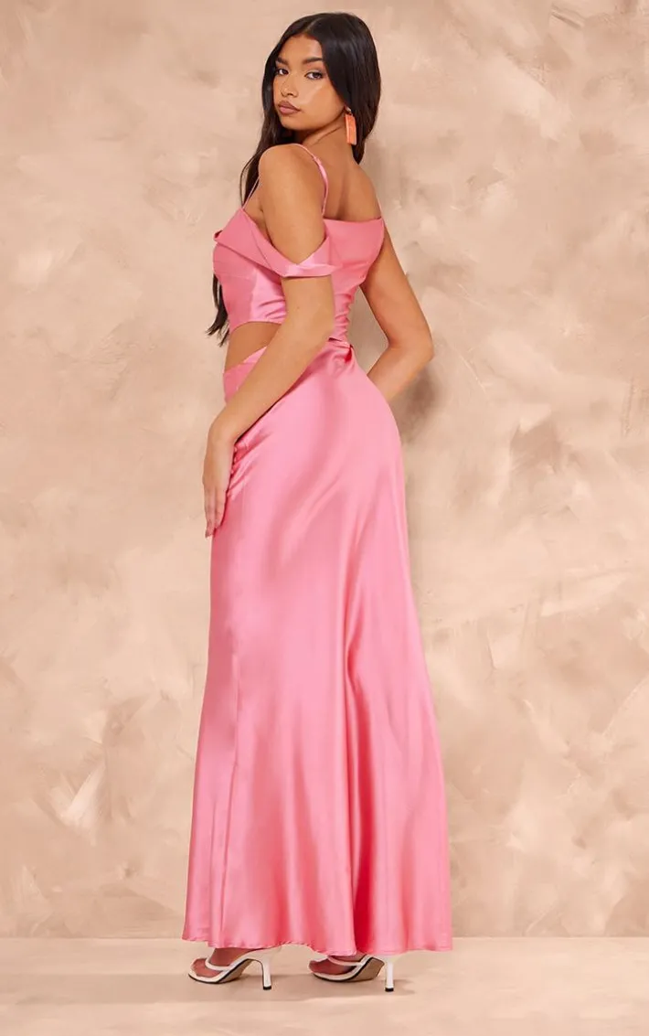 Got an occasion coming up ? Look no further than this pink satin asymmetric cut out maxi dress, it’s calling your name. Brought to you in a pink satin material with an asymmetric cut out detail, what more could you want? Style this maxi dress with your go-to heels and accessories to be the best dressed in the room.