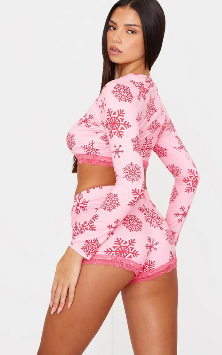 These pink snowflake print long sleeve short PJ set are a must-have for your new season sleepwear collection. Cosy starts here. Made from a pink hue material with a snowflake print and long sleeves, this short PJ set is a must have. Your cosy everyday has just been elevated. Style with simple accessories and fluffy socks for a cosy finish perfect for those nights in.