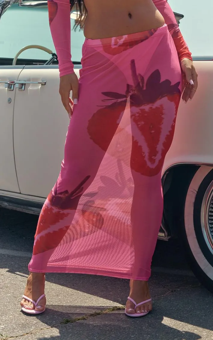 Turn heads for all the right reasons with this pink strawberry printed mesh maxi skirt. Brought to you in a pink mesh material with a maxi length and strawberry printed design, how can you resist? Style with the matching top, heels and gold accessories for a look that won’t miss.