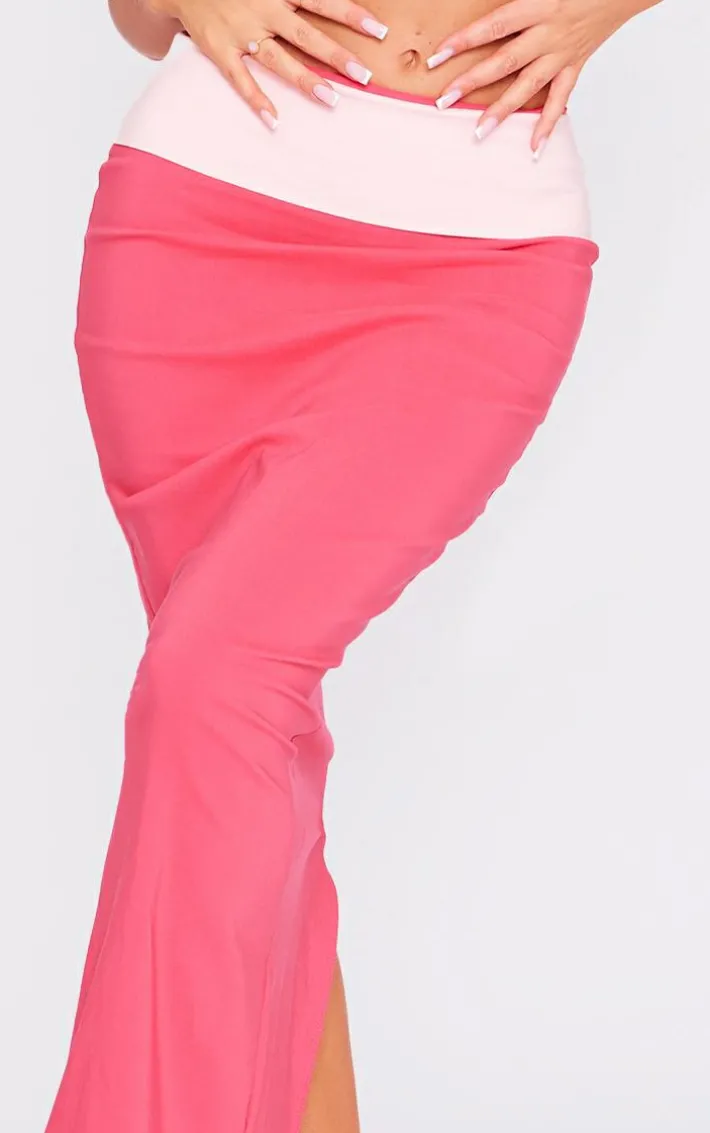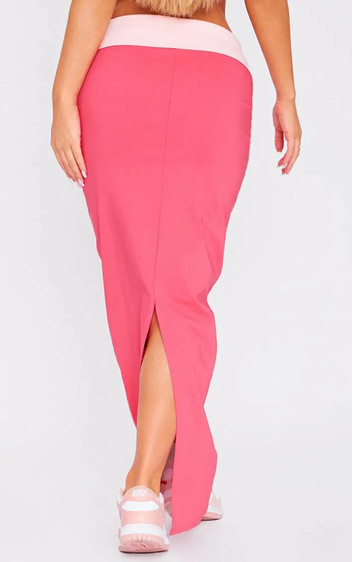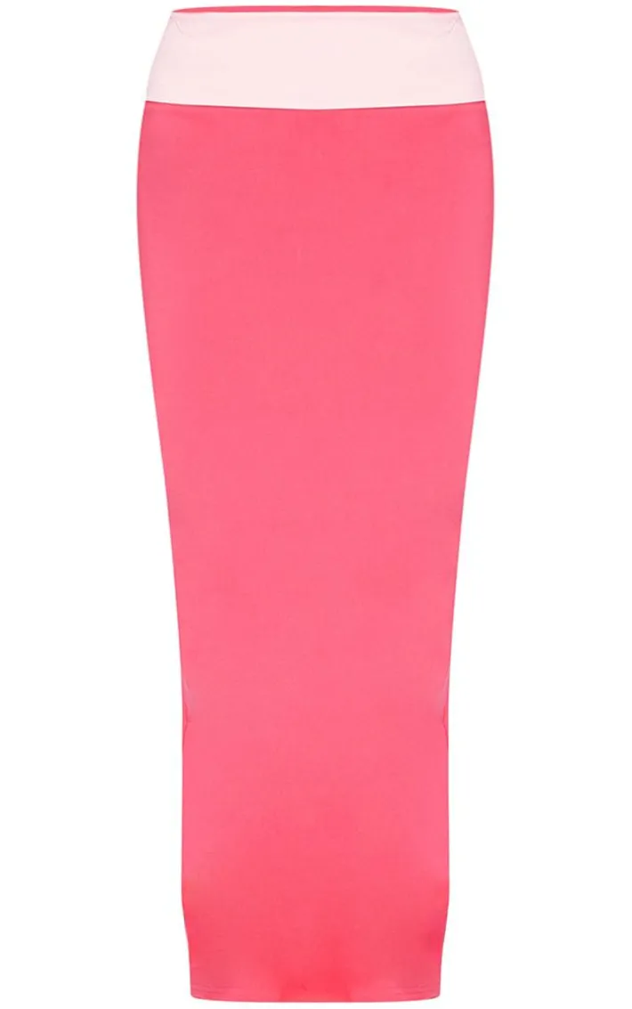 Add a pop of pink into your new season wardrobe with this pink stretch woven foldover detail maxi skirt, get ready to earn all the likes. This skirt features a pink stretch woven material with a foldover detail and a maxi length. Pair this woven skirt with a crop top, sneakers and simple accessories for a look everyone will be asking about.