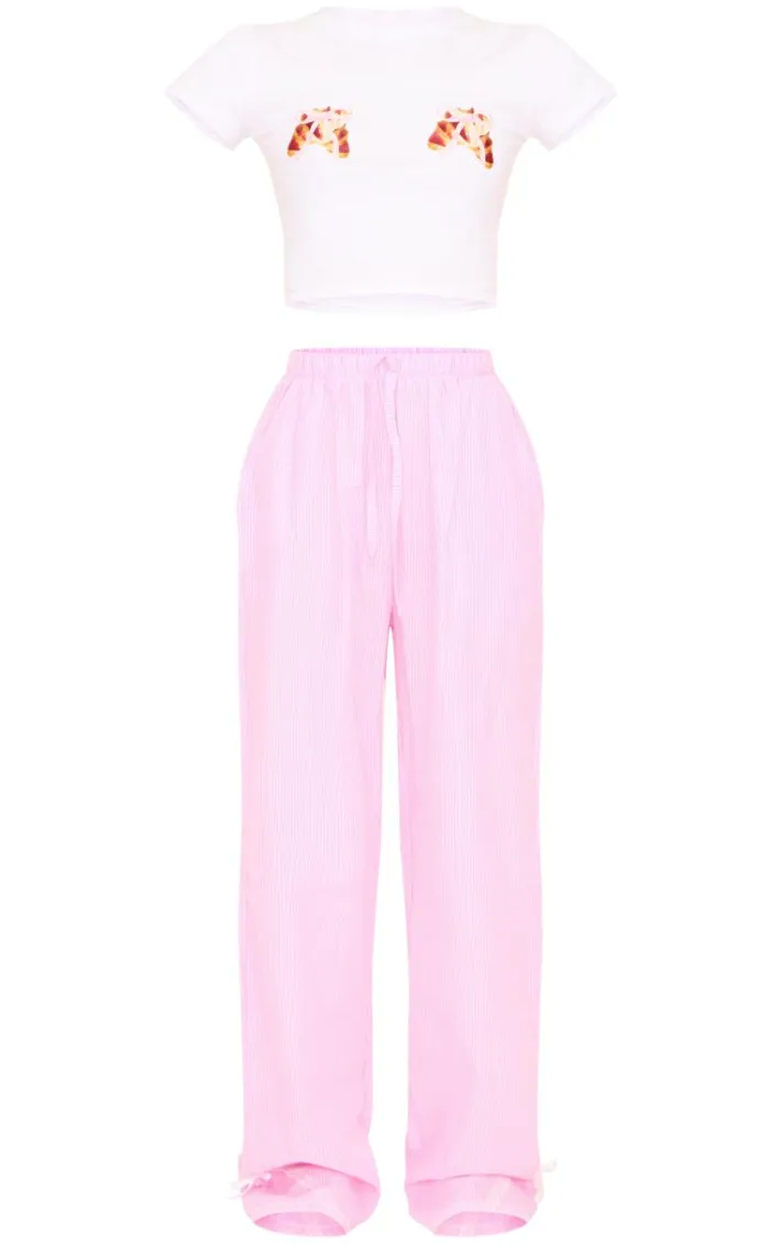 Give your pajama collection the upgrade it deserves with this pink stripe croissant bow long pant lace detail set. This set includes a t-shirt with a croissant bow design and matching striped pants, we are in love? Style this pink set with fluffy slippers for the perfect night in outfit.