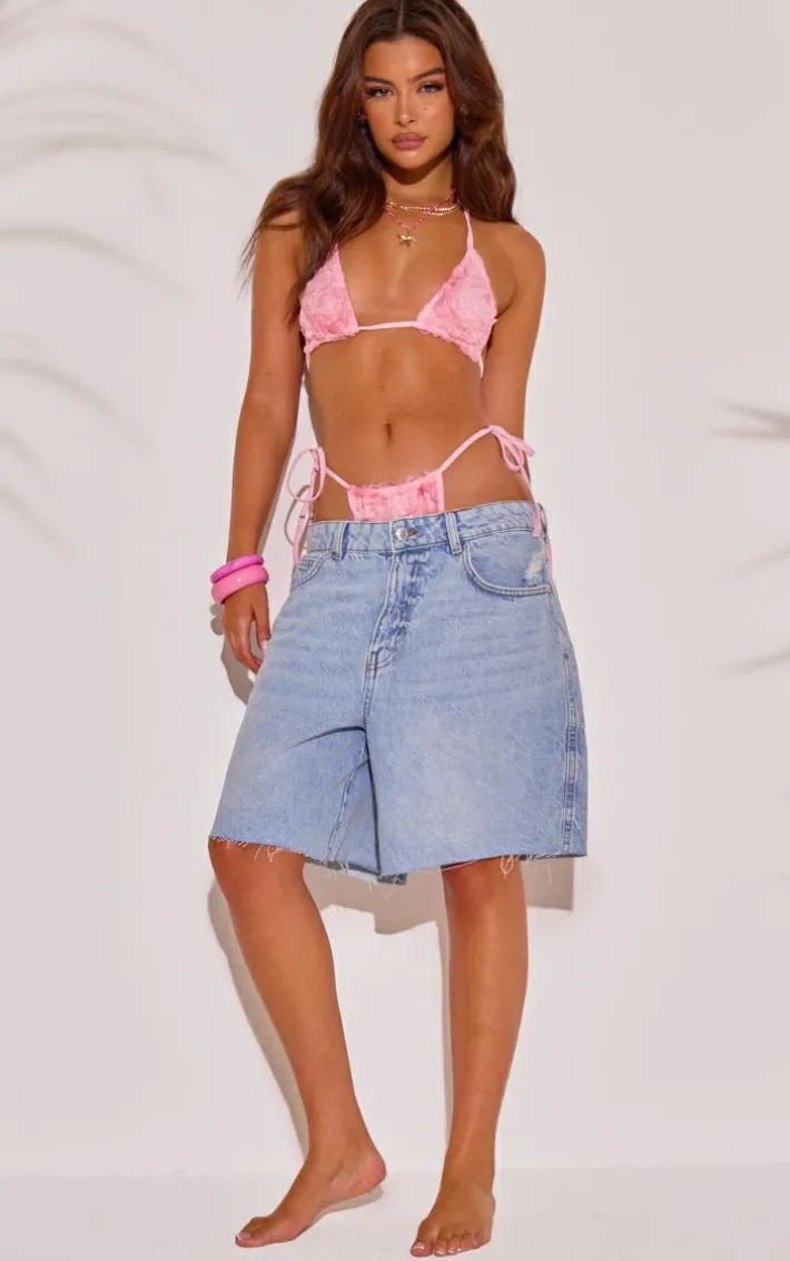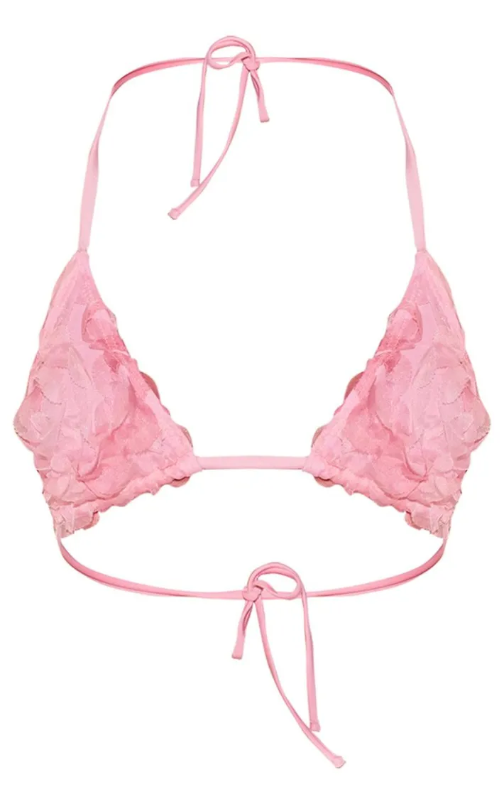 Keep it feminine with this pink textured mesh triangle bikini top. Brought to you in a pink textured mesh material with a triangle design, what more could you want ? This bikini top is perfect for those poolside days. Team this unreal bikini top with the matching bikini bottoms to finish off the look we are loving.