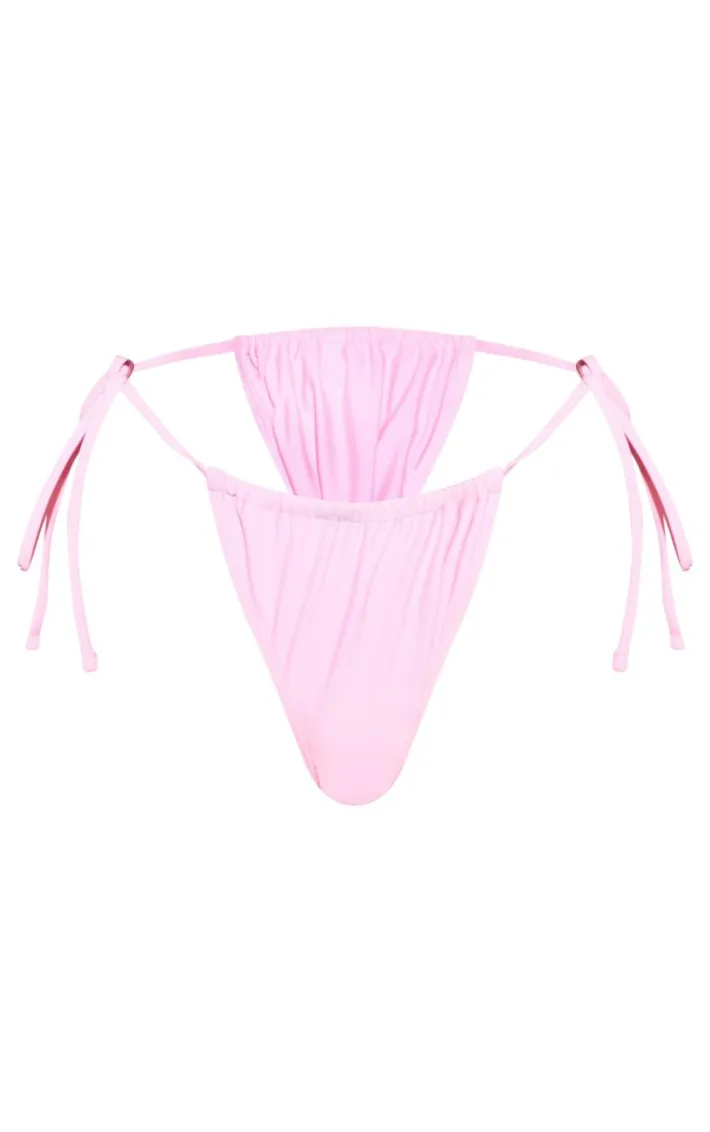 These pink tie side ruched bikini bottoms are perfect for your next holiday. Brought to you in a pink hue material with a tie side fastening and ruched detail, what’s not to love? These bikini bottoms are at the top of our wish list. Pair with the matching bikini top and gold accessories for a poolside finish we can’t get enough of.
