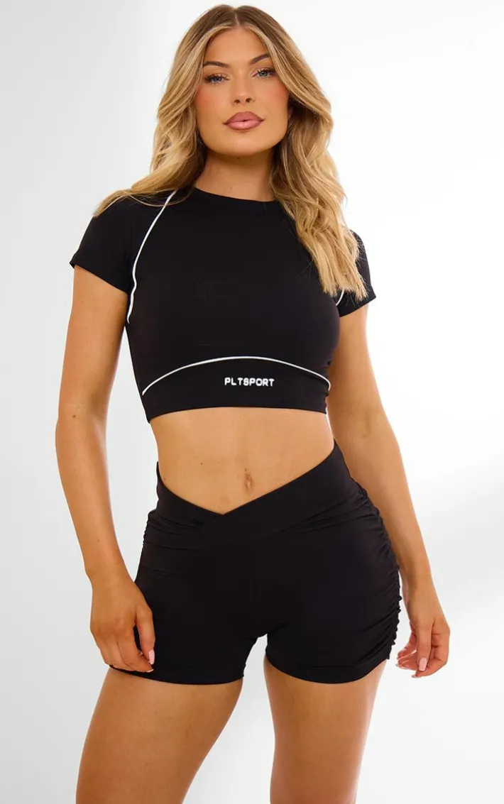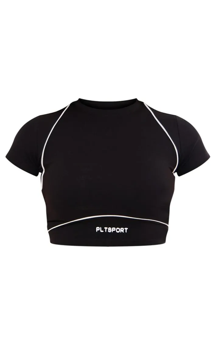 Make room in your activewear wardrobe for this PLT Sport black sculpt contrast binding tie detail crop top, we just can’t get enough. This top features a black material with a contrasting binding design and a tie detail. Just add matching hue shorts, sneakers and your fave accessories for a look that will show off your confident side.