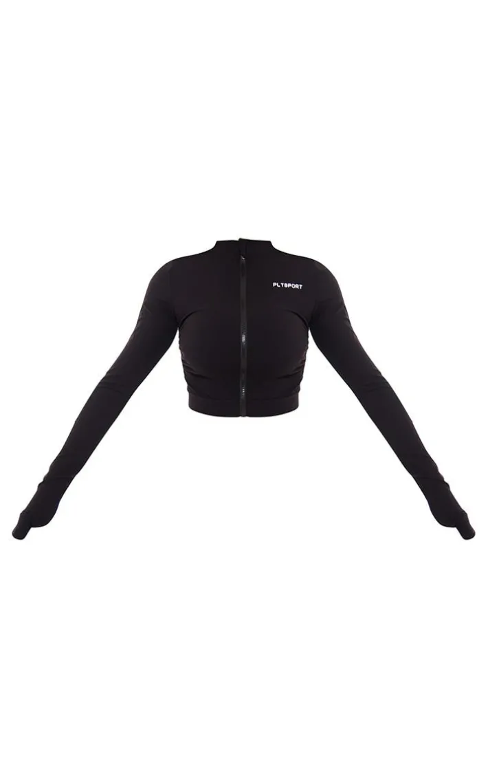 Upgrade your workout wardrobe with this black PLT Sport sculpt side ruched sports jacket. Brought to you in a black sculpt material with side ruching and ‘PLT Sport’ print, what’s not to love? Simply pair this sports jacket with gym shorts, sneakers and accessories for a combo even your gym crush will be crushing on.