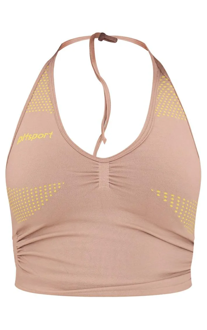 Update your workout wardrobe with this light mocha PLT Sport seamless contrast branding ruched side halterneck top. Brought to you in a light mocha seamless material with a ruched side and the brand ‘PLT Sport’ along the side, this is the ultimate sporty vibe. Pair these with the matching shorts, sneakers, and accessories for an outfit worth the sweat.
