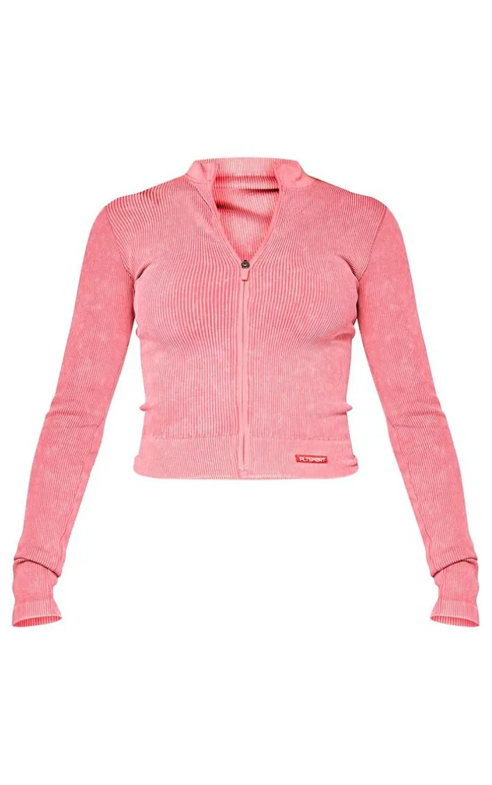 Switch up your workout style game with this PLT Sport raspberry acid wash seamless zip up cropped sports jacket. Brought to you in a raspberry hue acid wash material with a zip up design, long sleeves and a seamless fit, how can you go wrong? Team this cropped sports jacket with the matching shorts and sneakers for a look that is sure to make heads turn wherever you go.