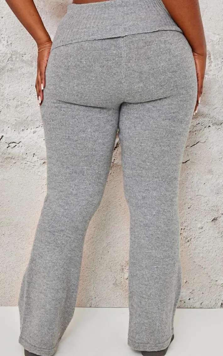You won’t have to sacrifice comfort for style with these plus ash grey melange soft knit foldover waist flared pants. Brought to you in an ash grey melange soft knit material with a foldover waist design and a flattering flared leg fit, how can you resist? Style these flared pants with a top, sneakers and simple accessories for an effortless everyday look like no other.