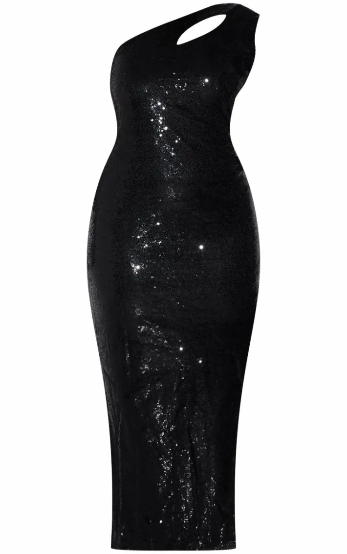 Look and feel your most confident self in this plus black asymmetric high split sequin maxi dress. Brought to you in a black hue sequin material with an asymmetric design and high split detail, this maxi dress is calling your name. Style with gold heels and accessories for a flattering finish that won’t go unnnoticed.