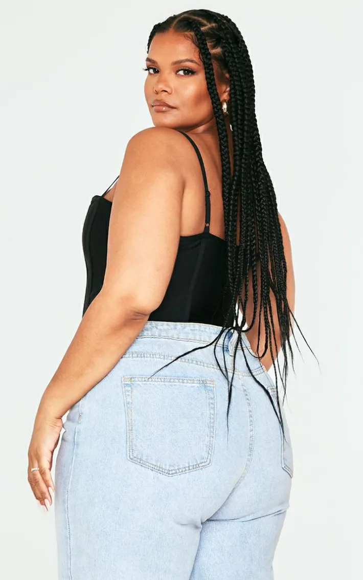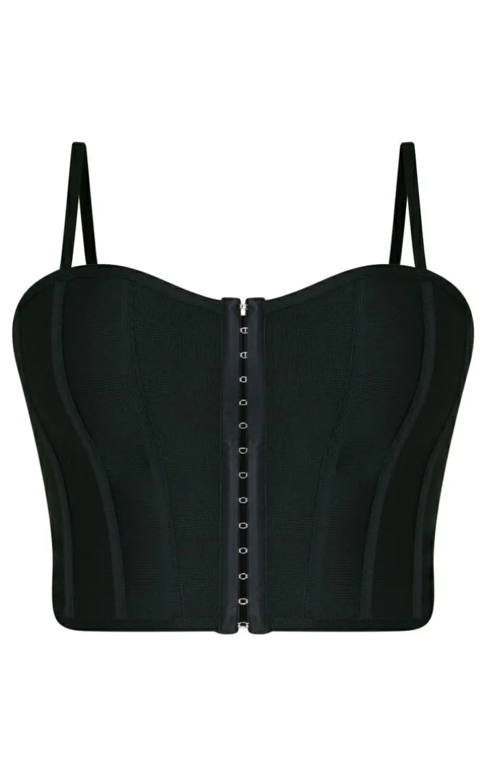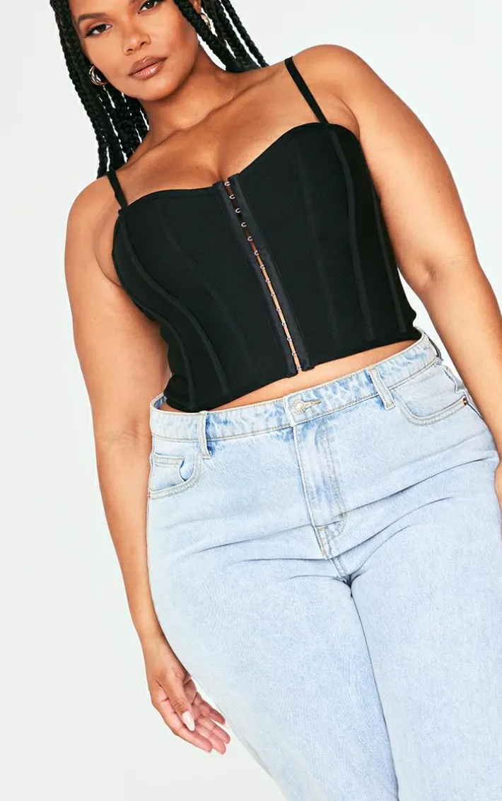 Take your weekend look to the next level with this plus black bandage hook and eye structured corset. This corset is brought to you in a black bandage material with a hook and eye design and a figure-flattering fit, how could you say no? This corset is everything we’re obsessing over this season. So what are you waiting for? Shop the look and style with denim jeans, clear high heels and accessories for a look that we can’t stop crushing on.