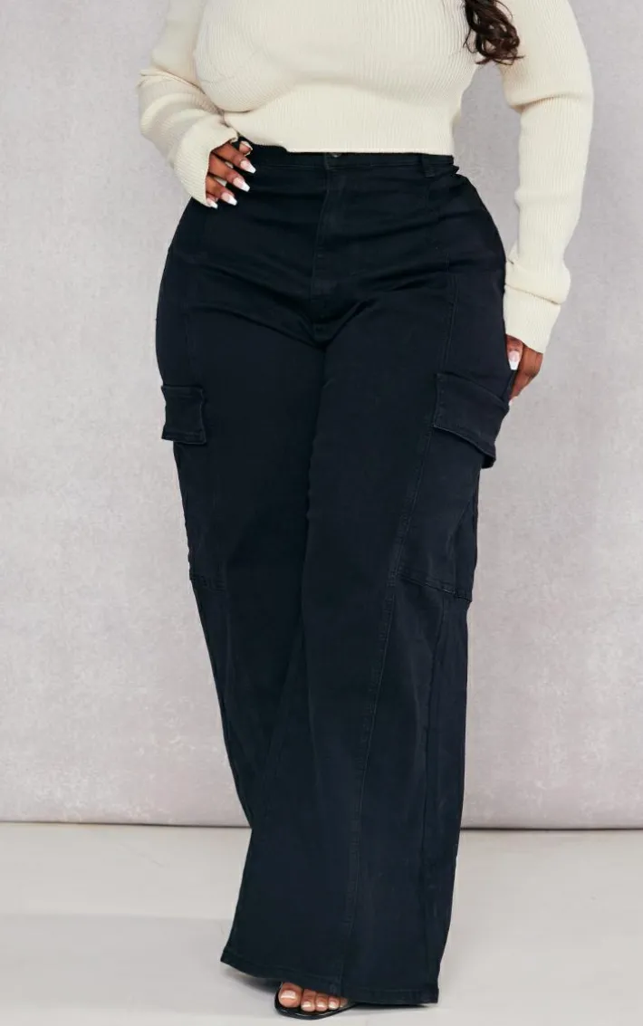 Get your style game on point with these cargo jeans. Featuring a black denim material with pocket detail and a wide-leg fit. Pair with a basic top and faux leather jacket to complete this dreamy look.