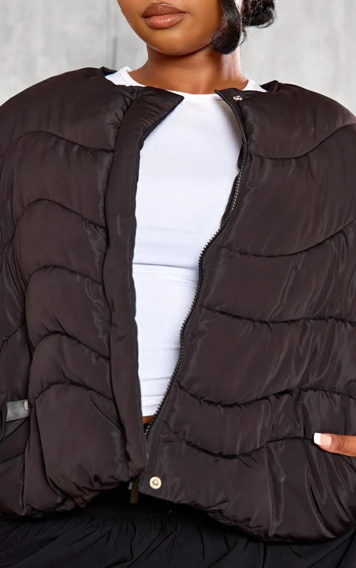 This plus black cropped round neck puffer jacket is sure to be your new go-to for everyday styling. Made from a black hue material with a round neckline and a zip through fastening, what more could you need? Layer this puffer jacket over your outfit of the day for a comfy yet chic finishing touch to any look.