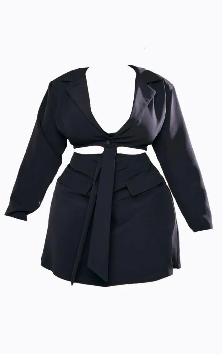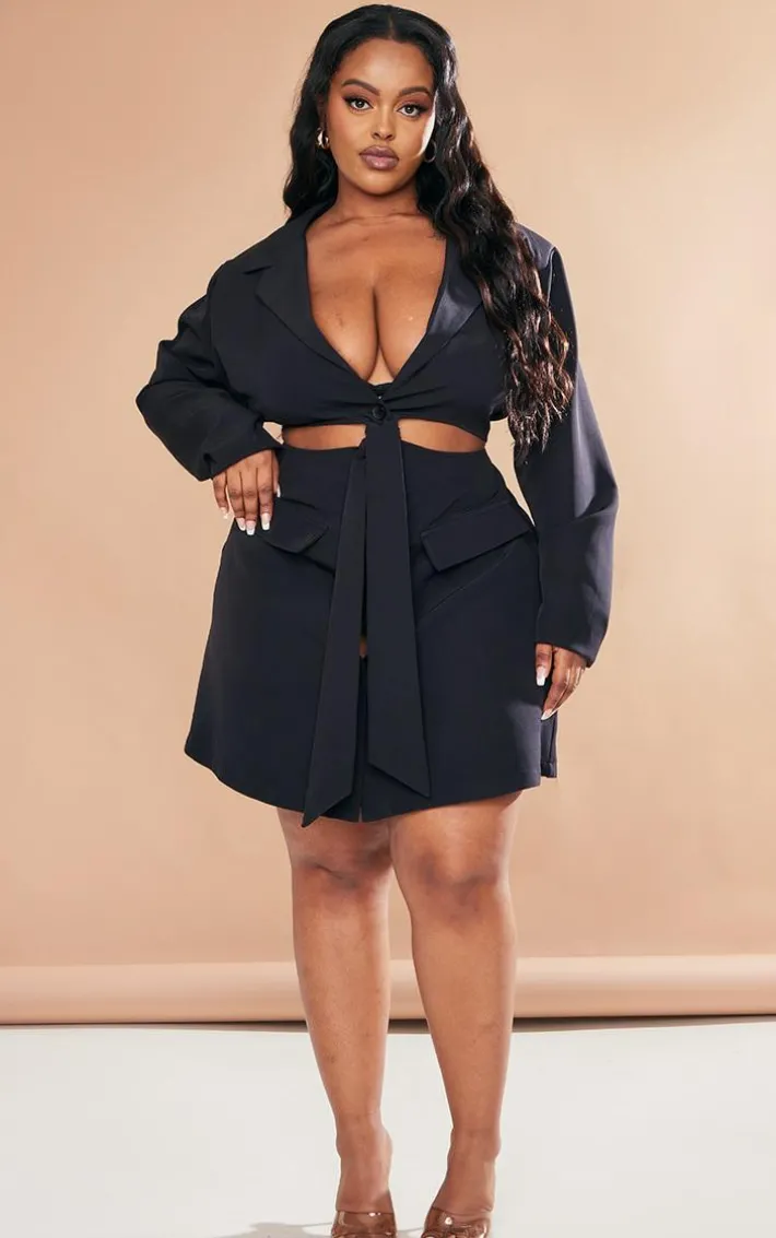 Make them stare this season with this plus black cut out knot front blazer dress. This blazer dress is made from a black hue with a cut out detail for a look that is sure to have you tapping into your feminine side. With a knot front, what more could you want? Style with a pair of clear heels and your fave go-to hoops for a look we are seriously obsessing over.